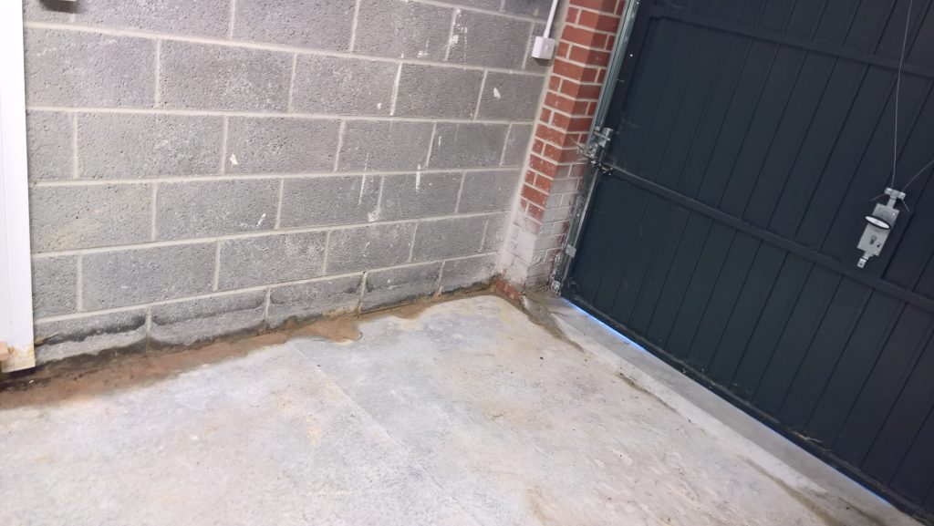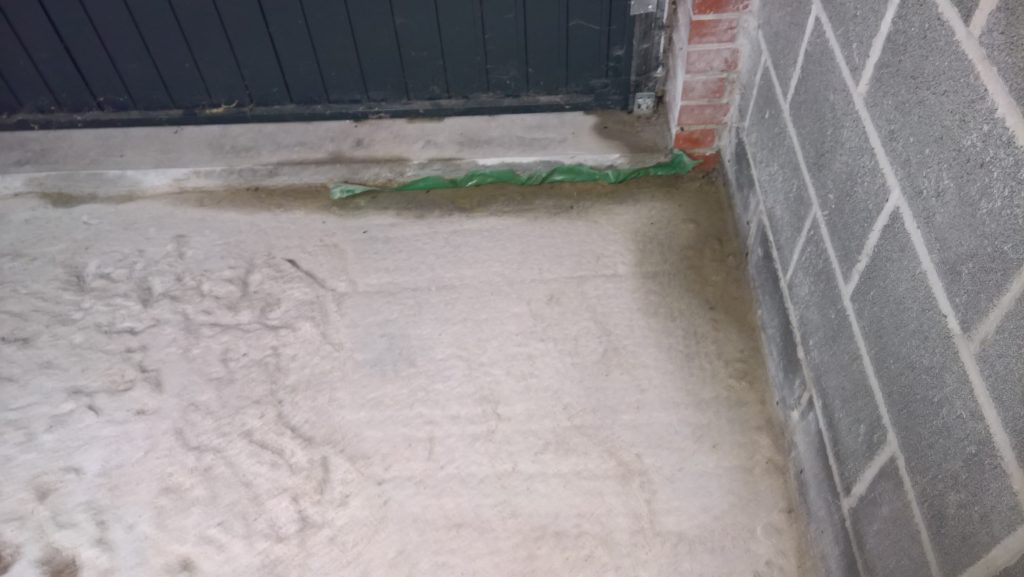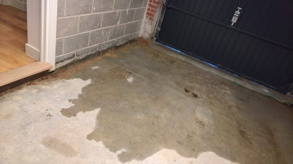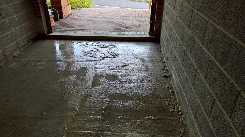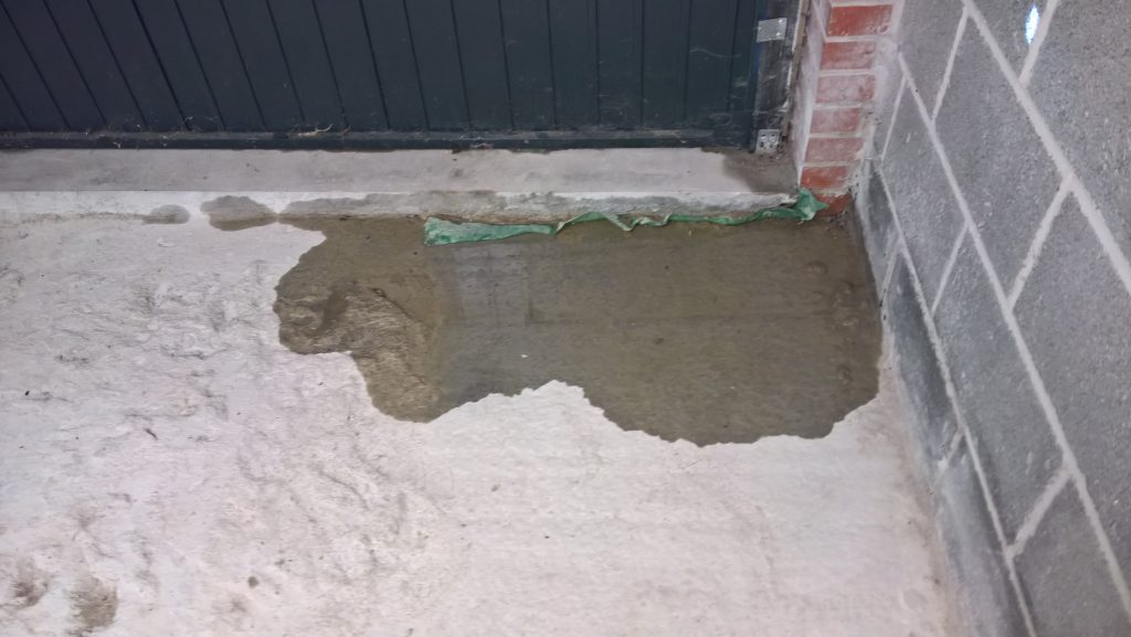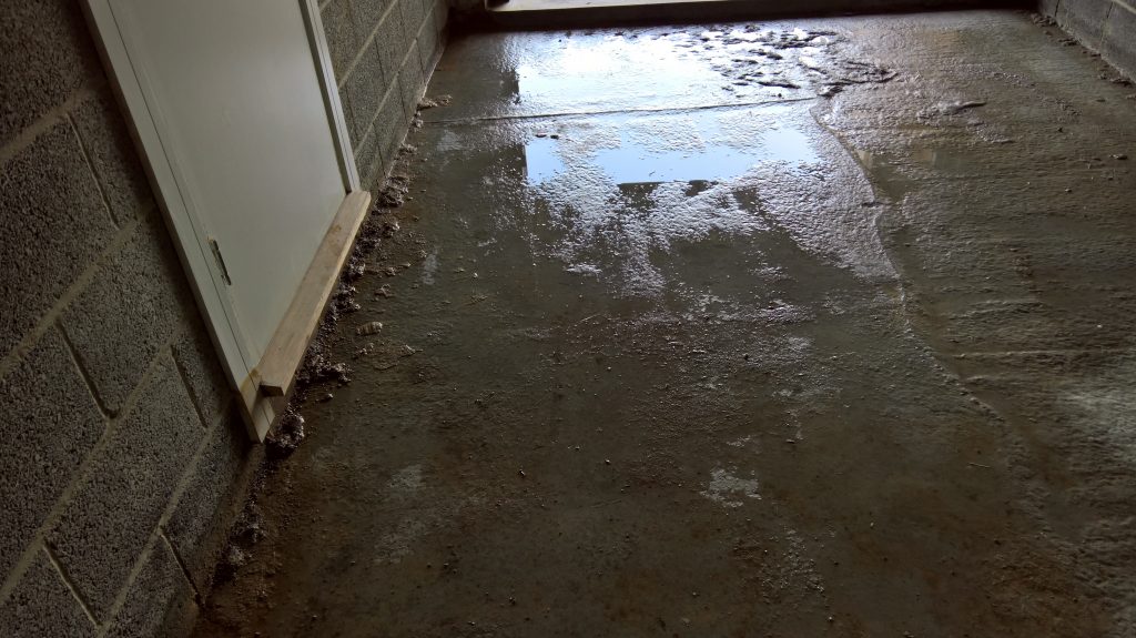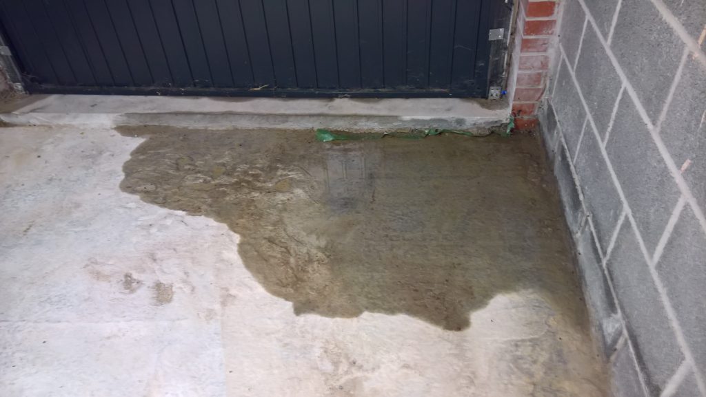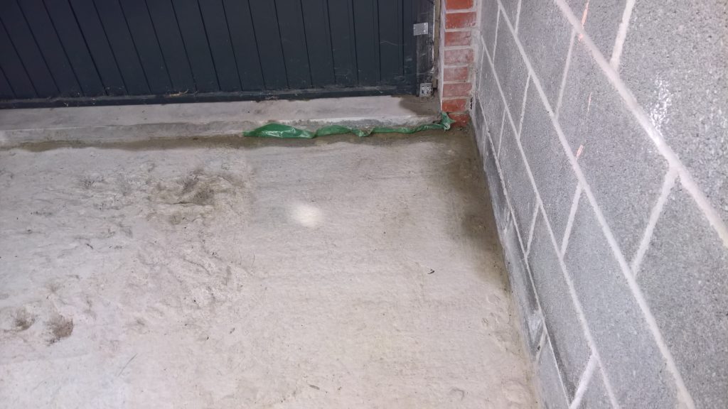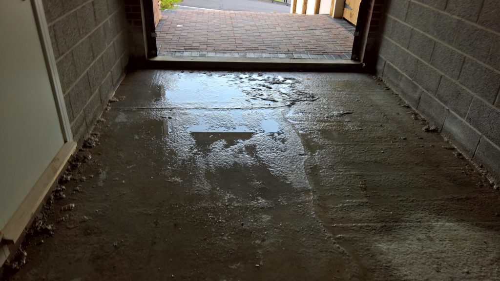 The image below illustrates what would happen without some ingress prevention. This picture was taken after only one day of showery rain. Until the screed was removed this water would have pooled under the screed surface in the garage and entered the house horizontally.
