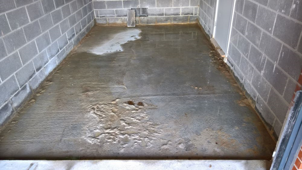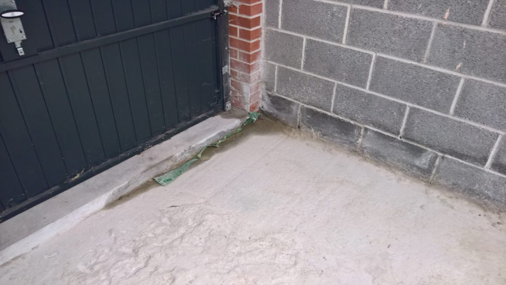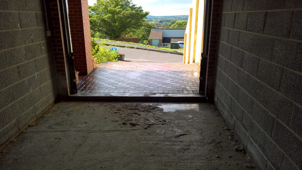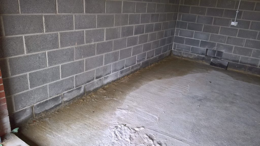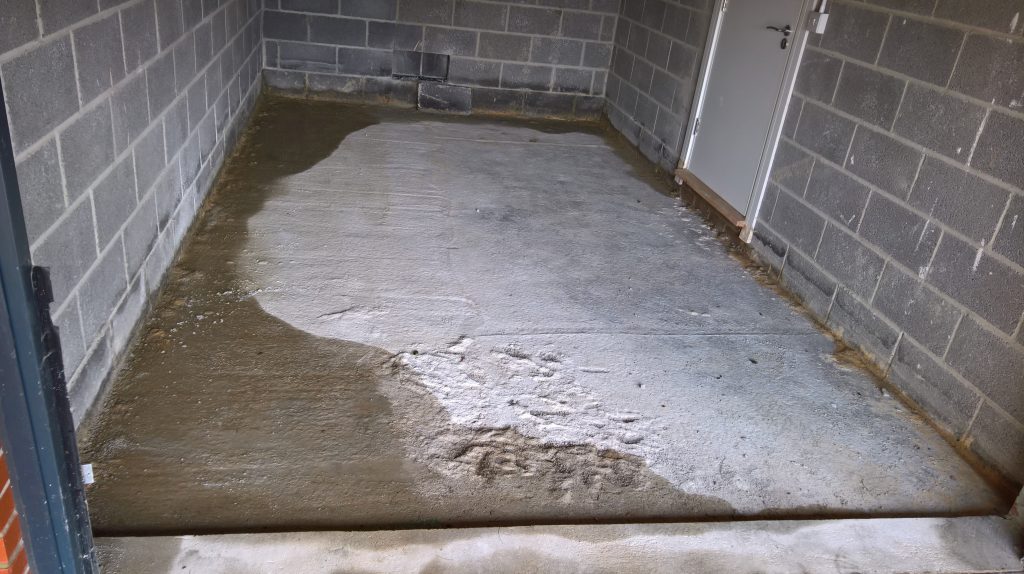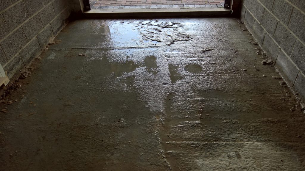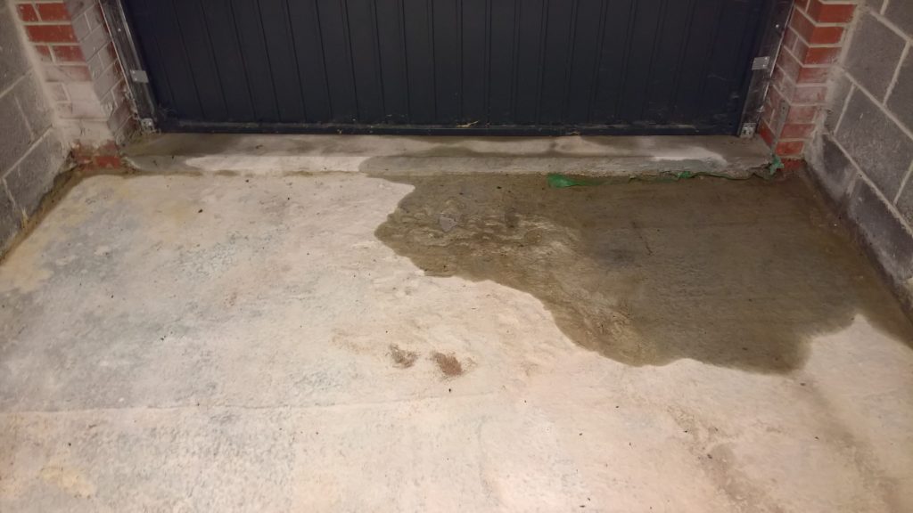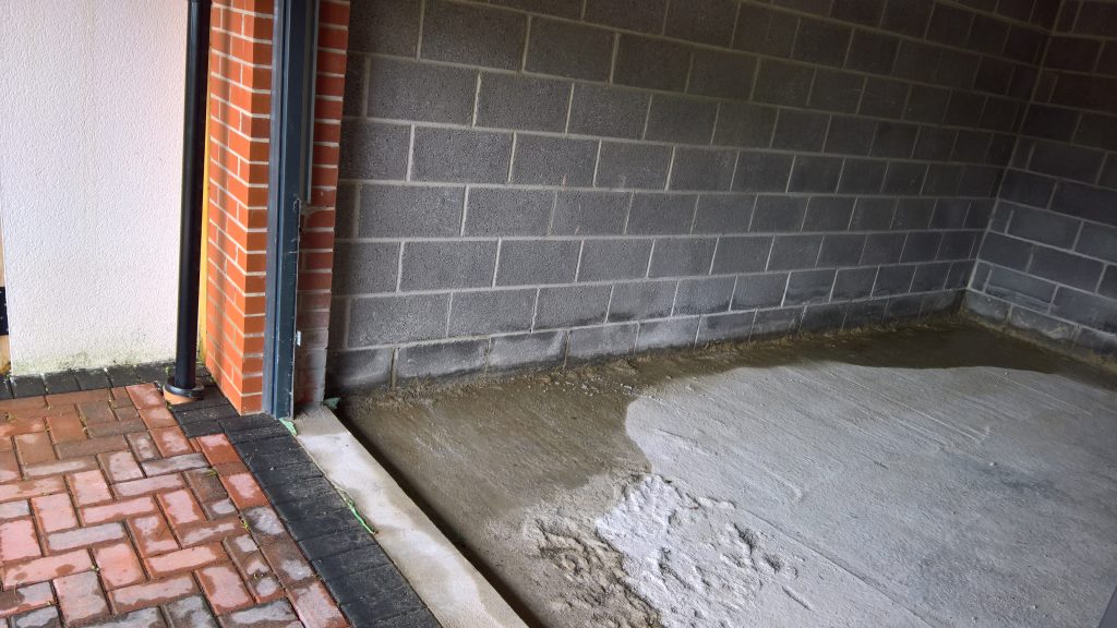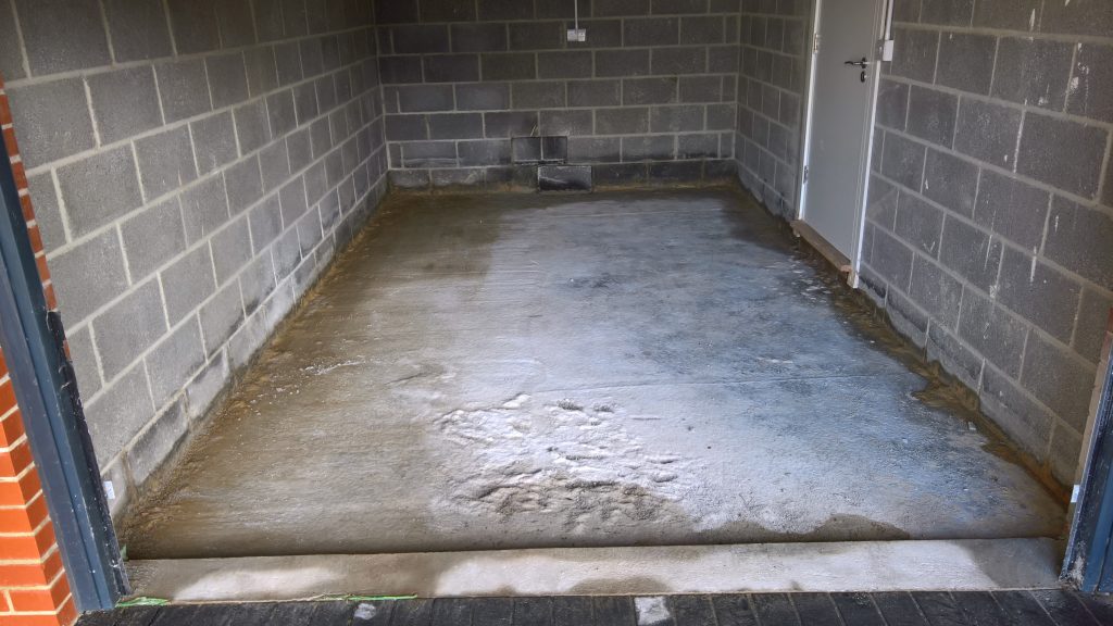 The image below illustrates what would happen without some ingress prevention. This picture was taken after only one day of showery rain. Until the screed was removed this water would have pooled under the screed surface in the garage and entered the house horizontally.
