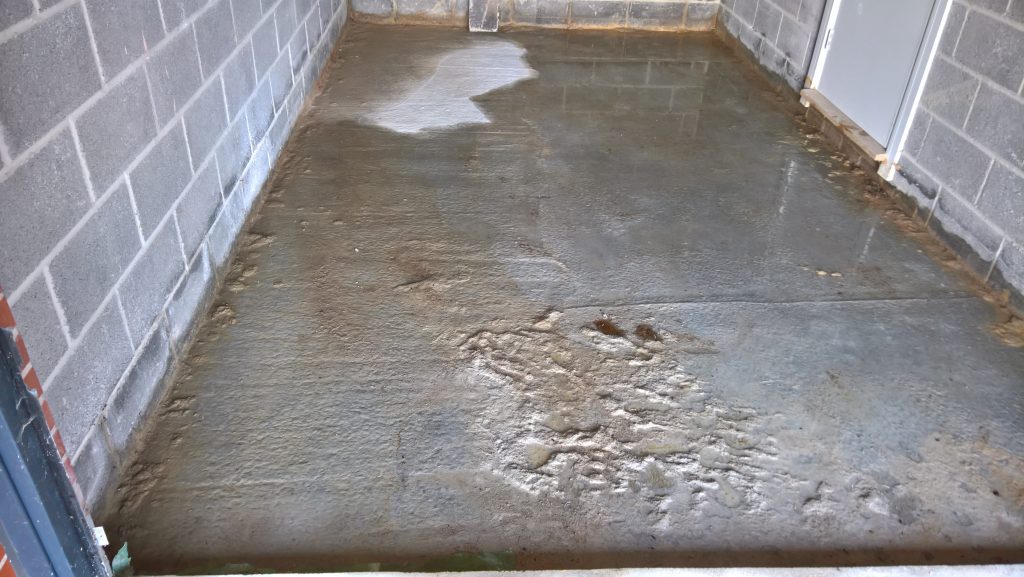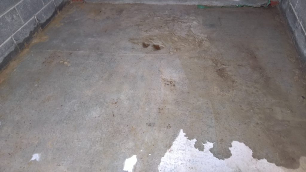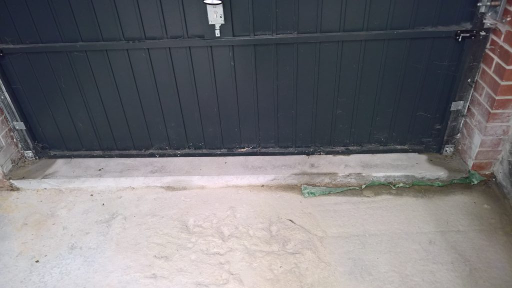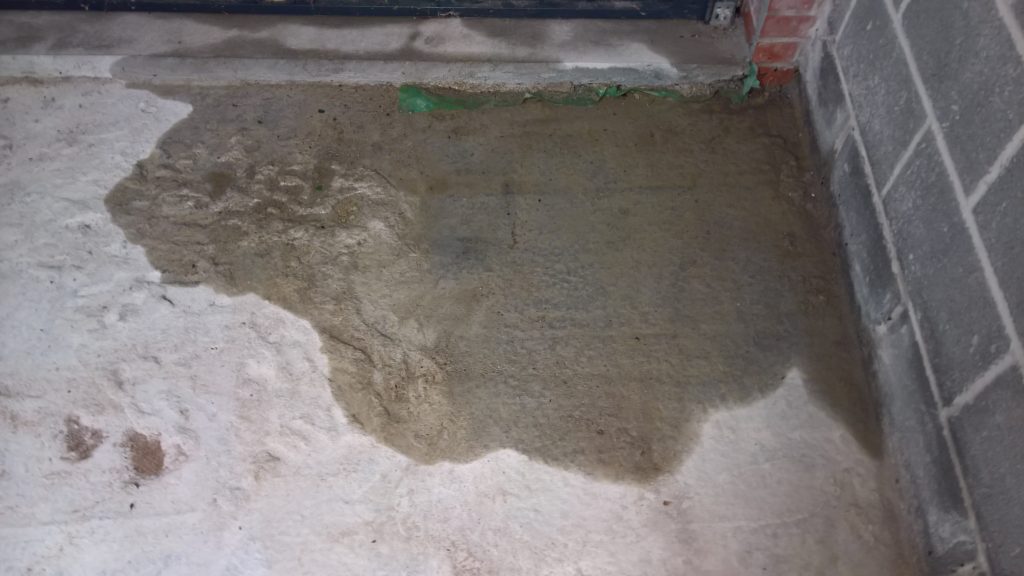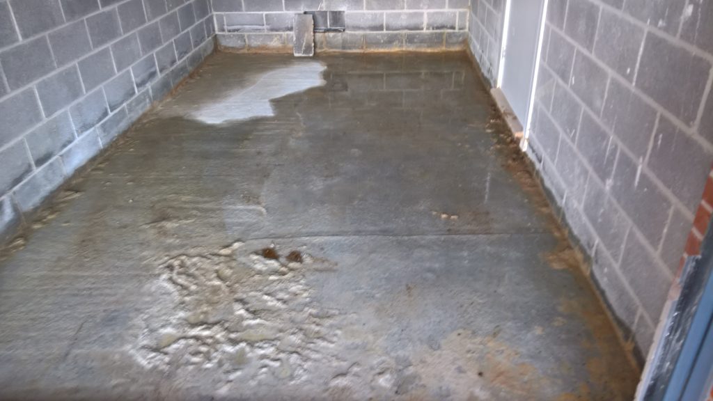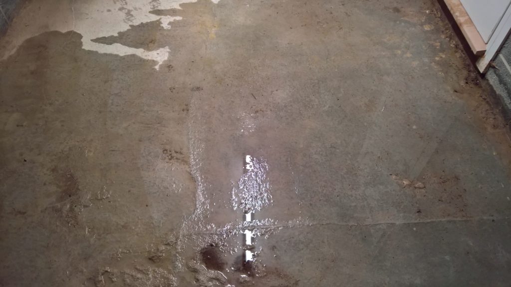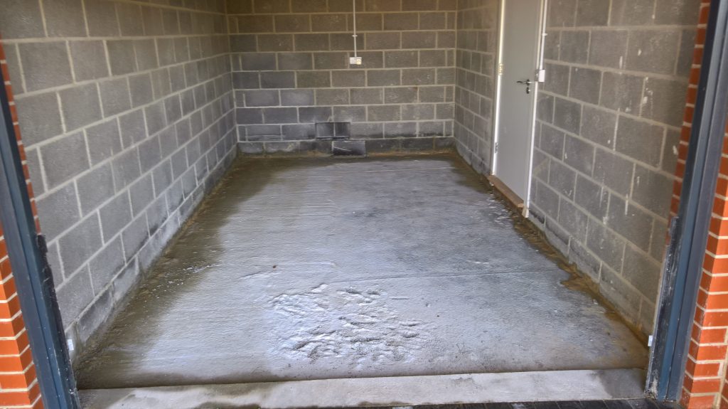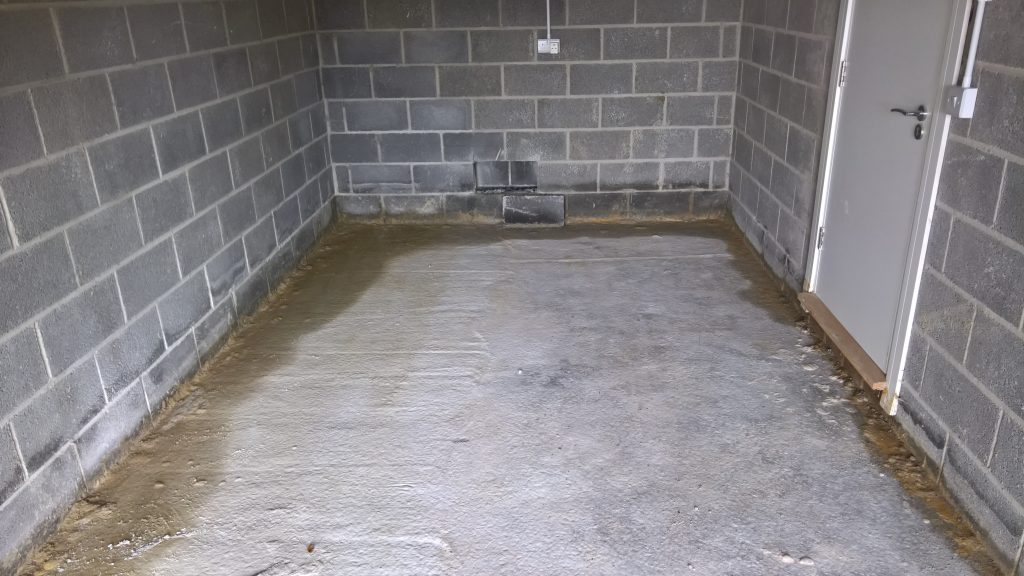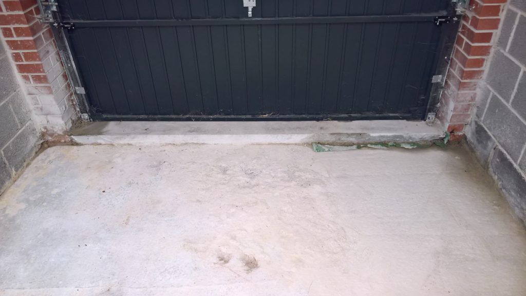The image below illustrates what would happen without some ingress prevention. This picture was taken after only one day of showery rain. Until the screed was removed this water would have pooled under the screed surface in the garage and entered the house horizontally.
