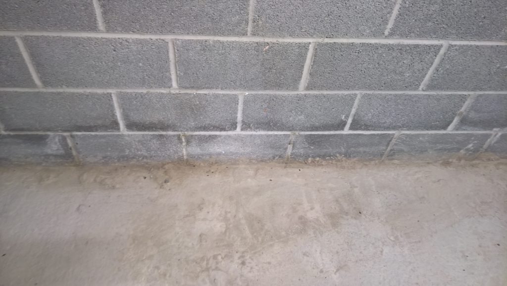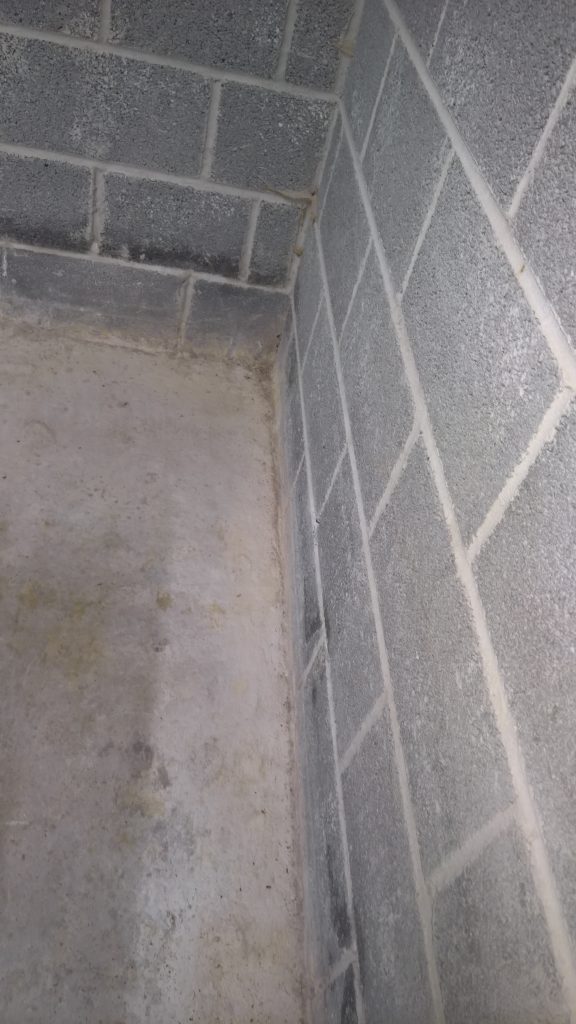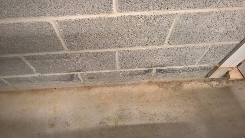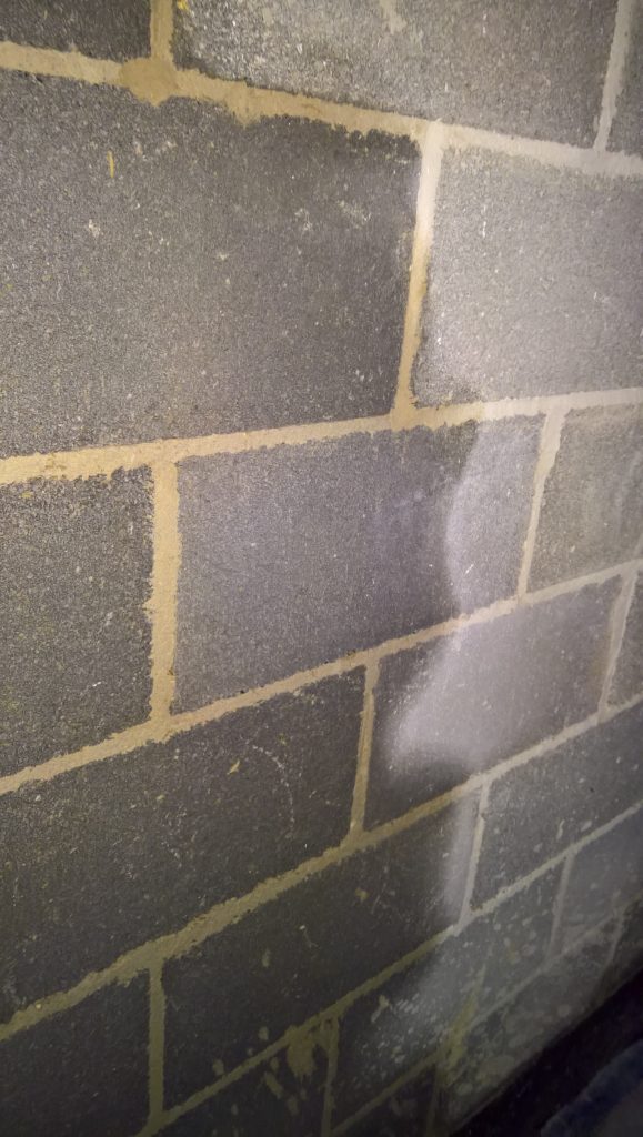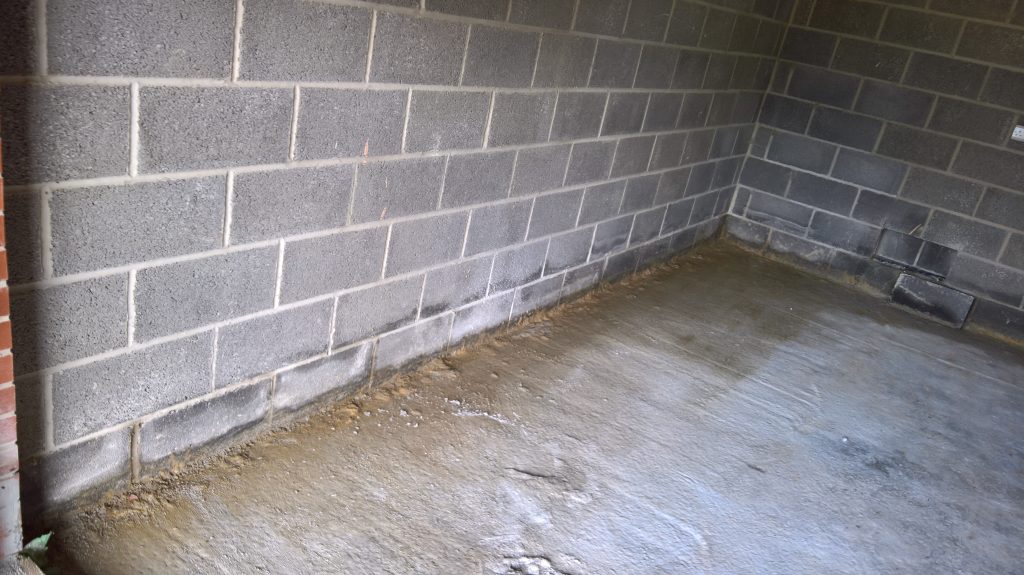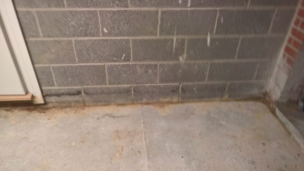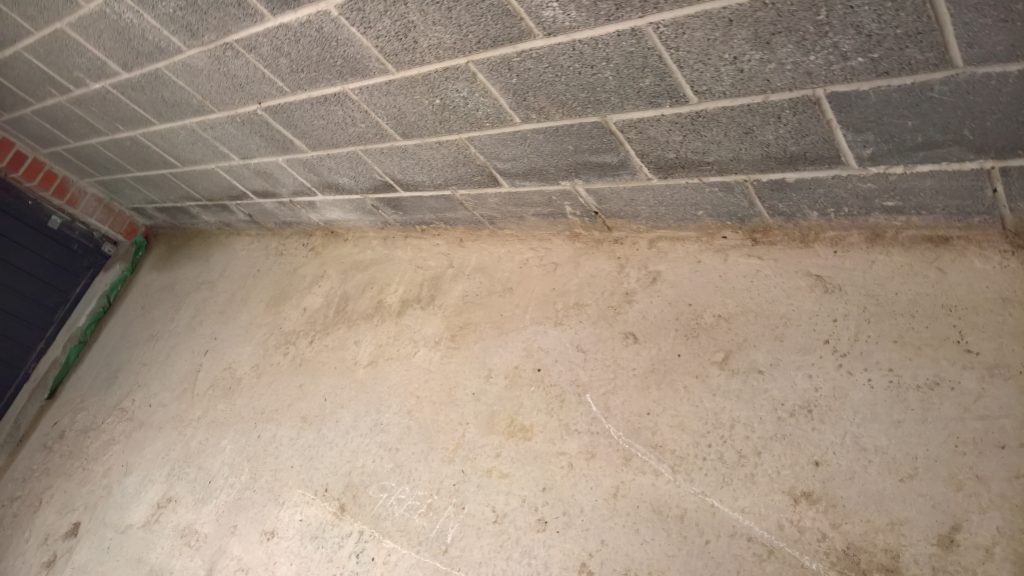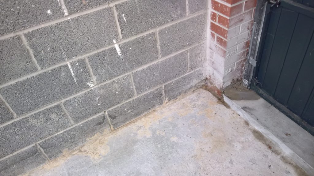 Dry and mild overnight. Garage drying very slowly back to walls. The residue of concrete (builders mixed concrete here perhaps) on top of the block may be facilitating the “wicking” of water from the side wall.