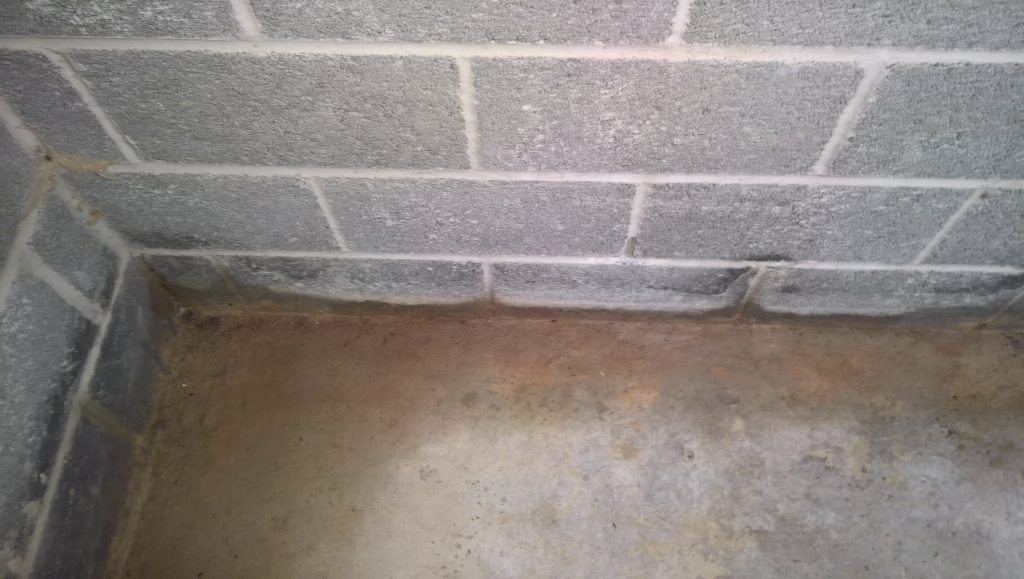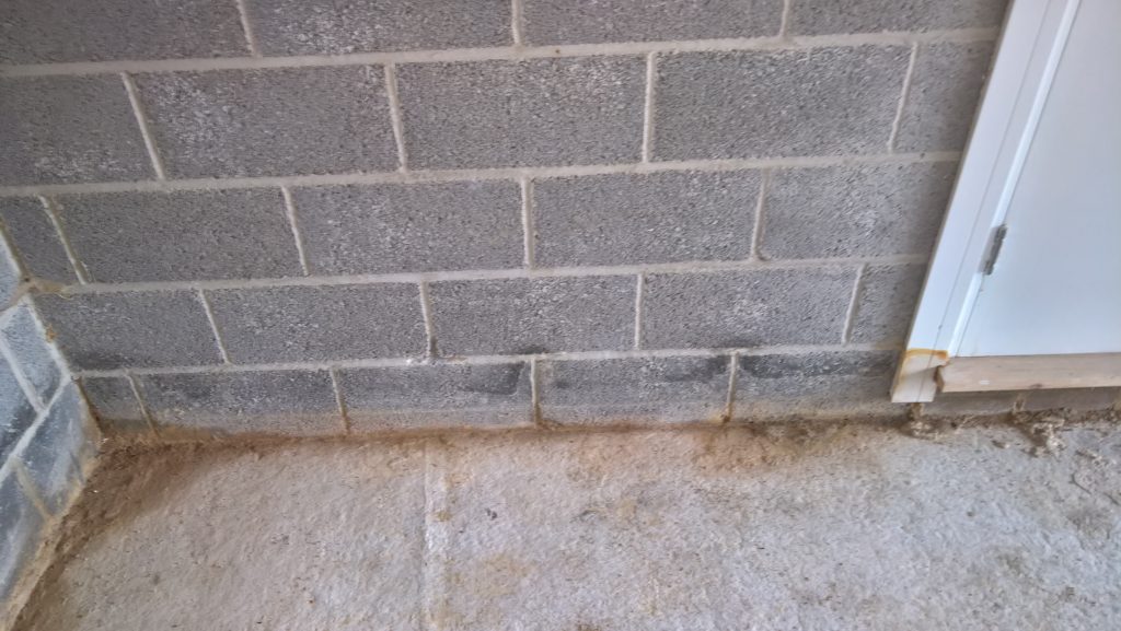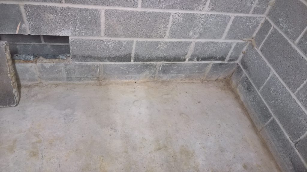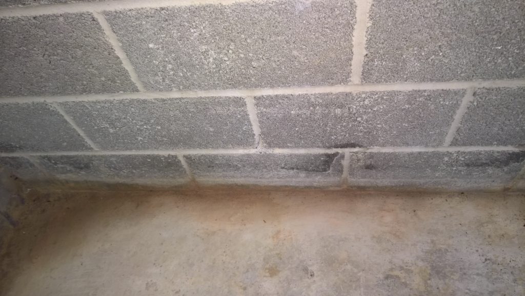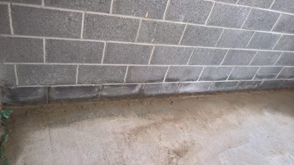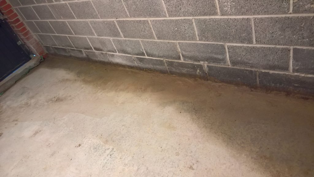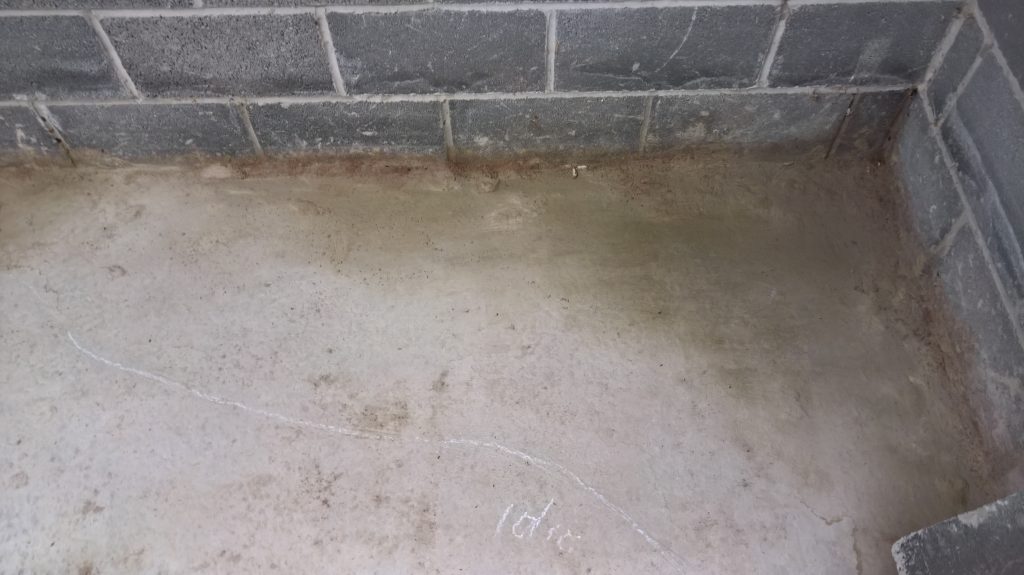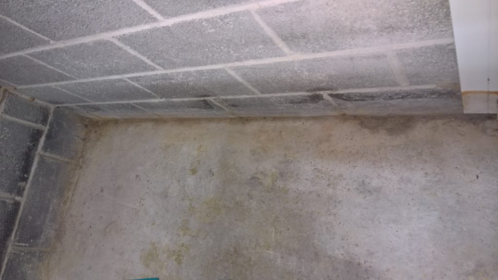 Dry and mild overnight. Garage drying very slowly back to walls. The residue of concrete (builders mixed concrete here perhaps) on top of the block may be facilitating the “wicking” of water from the side wall.