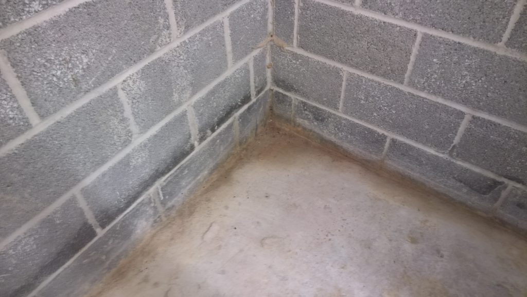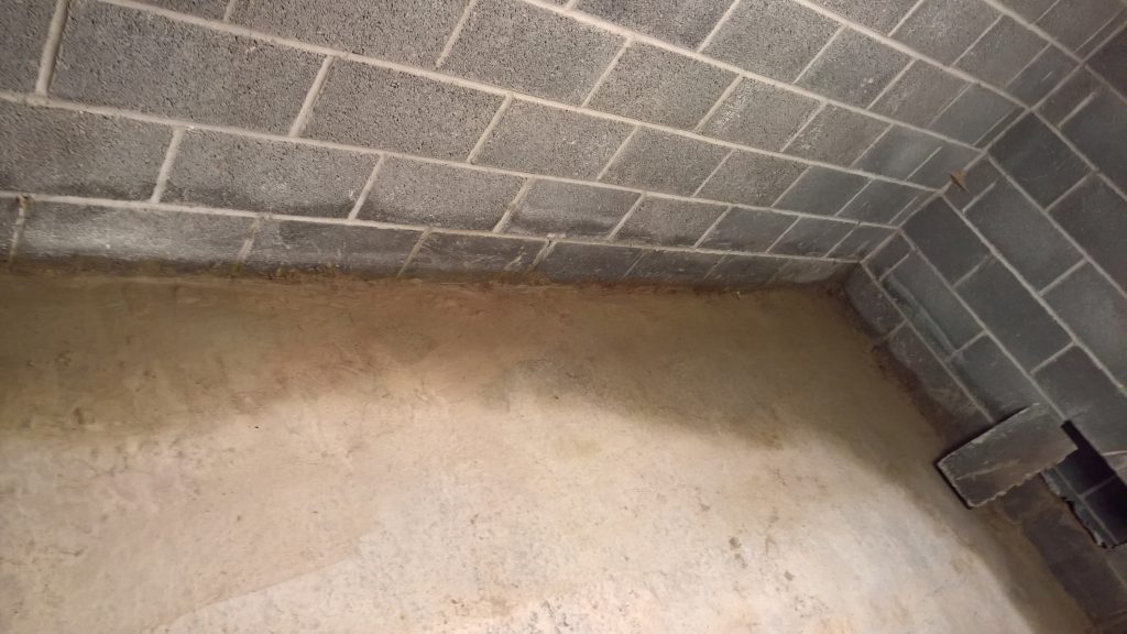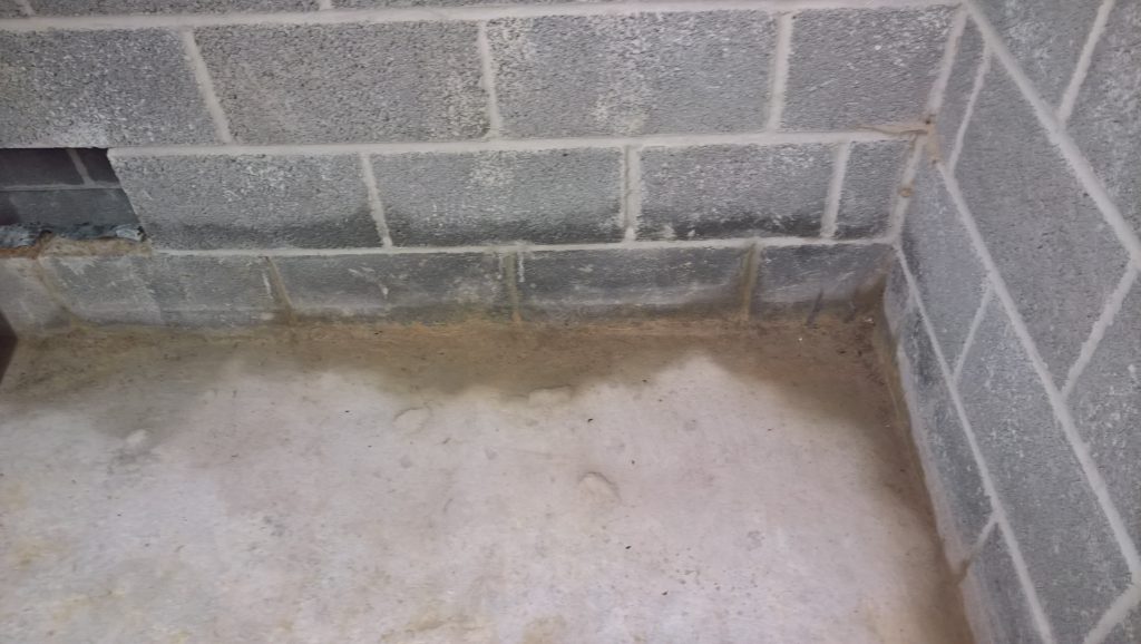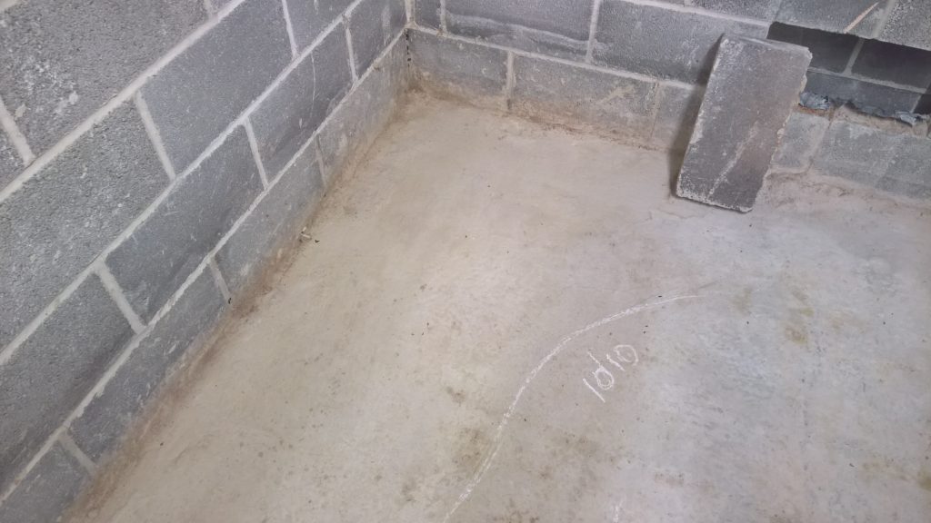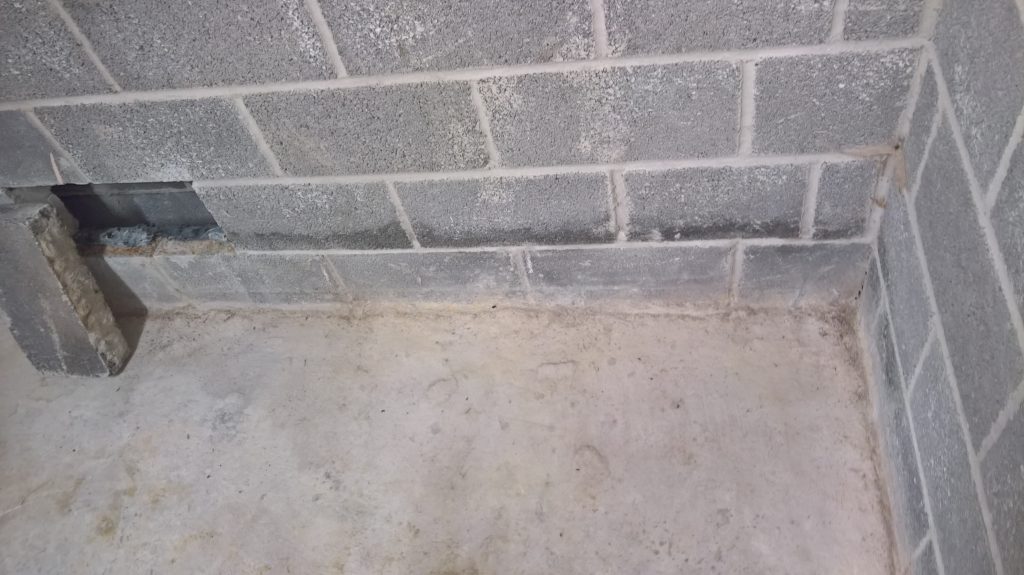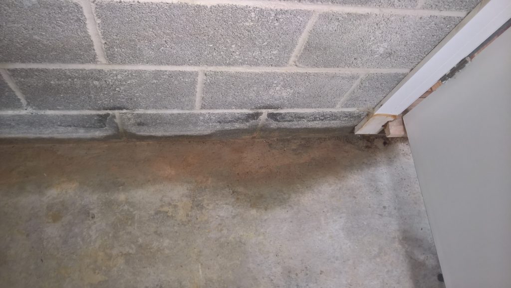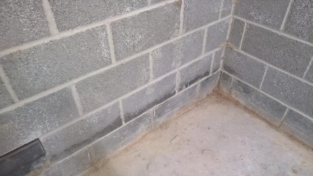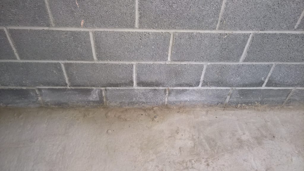 Dry and mild overnight. Garage drying very slowly back to walls. The residue of concrete (builders mixed concrete here perhaps) on top of the block may be facilitating the “wicking” of water from the side wall.