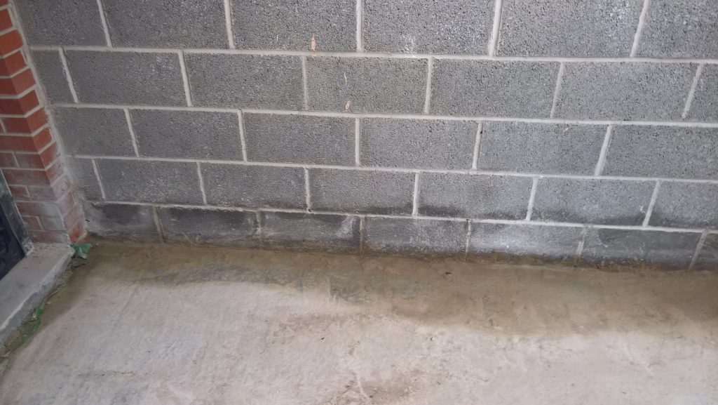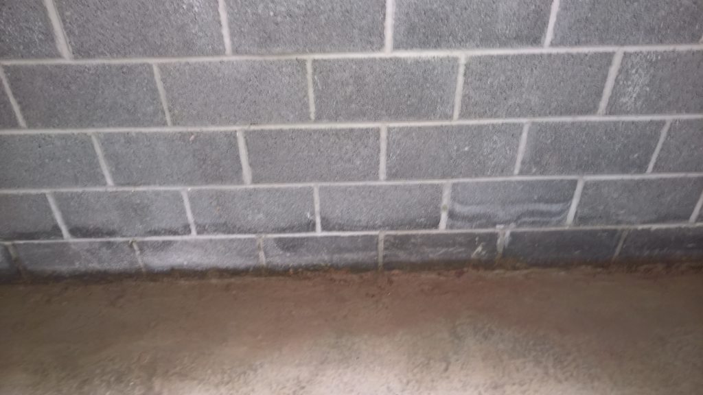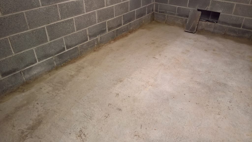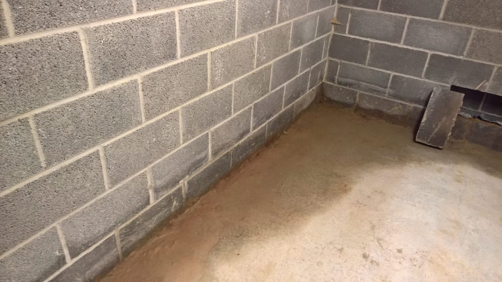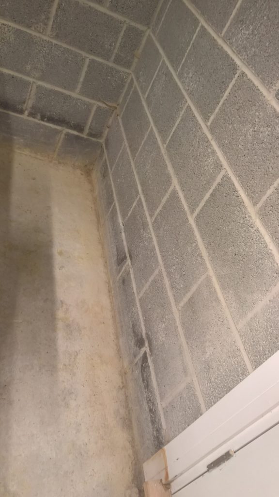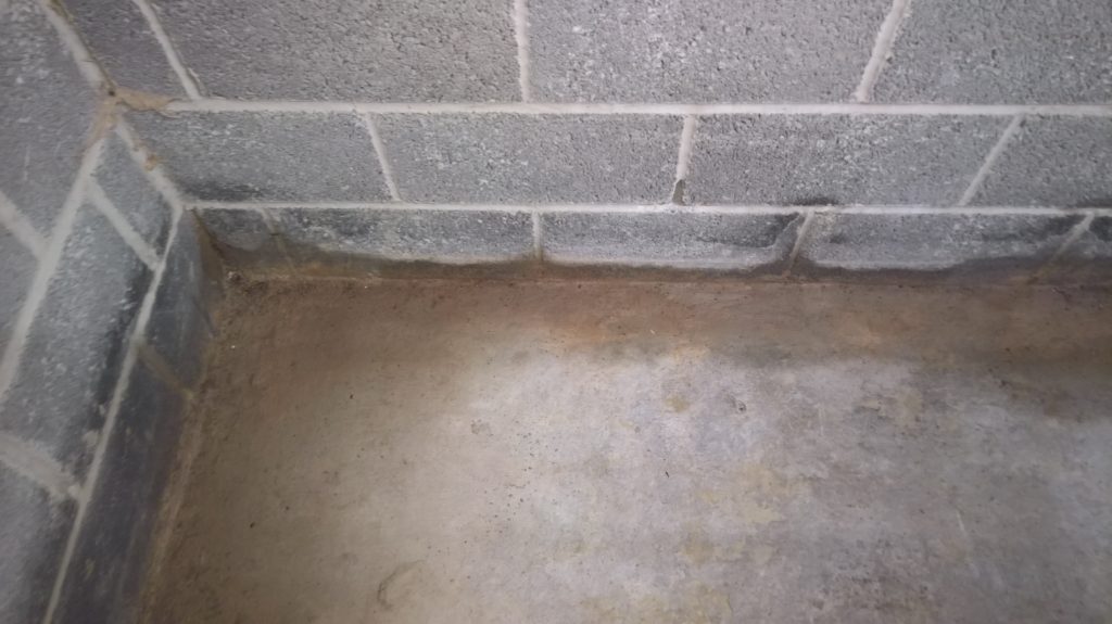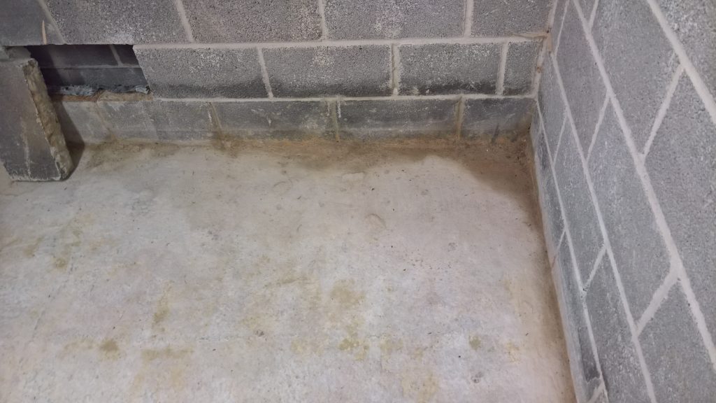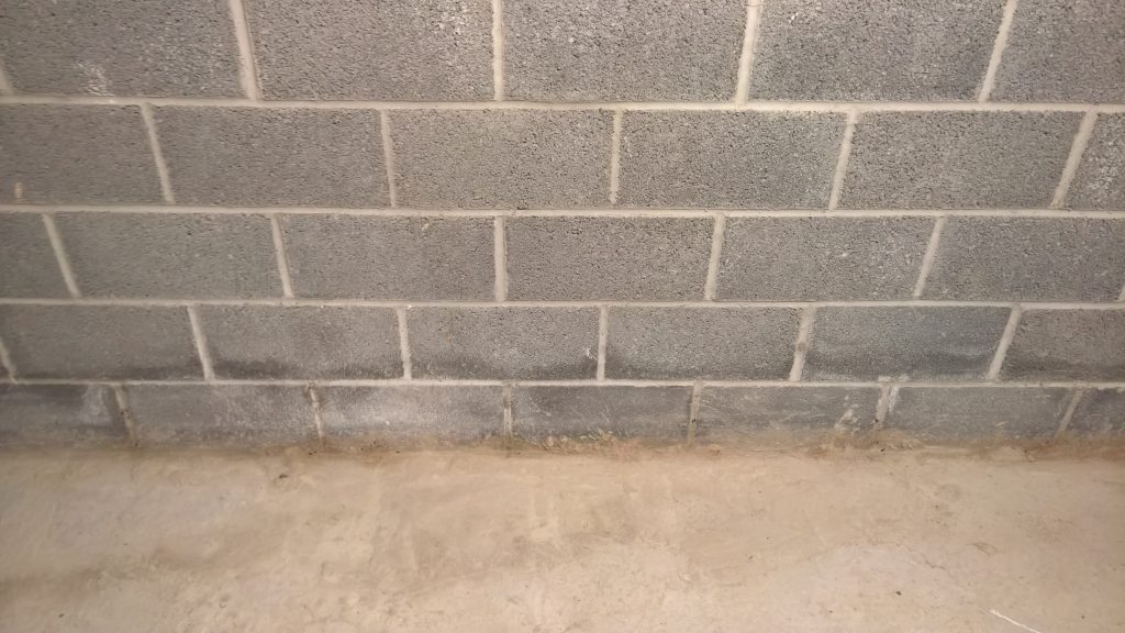 Dry and mild overnight. Garage drying very slowly back to walls. The residue of concrete (builders mixed concrete here perhaps) on top of the block may be facilitating the “wicking” of water from the side wall.