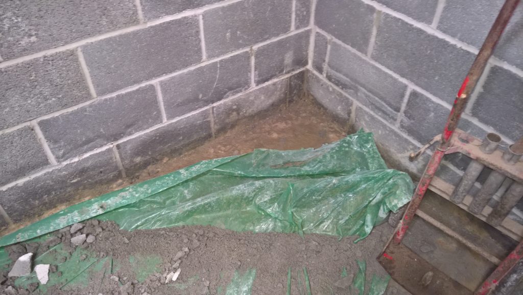 The remainder of green plastic sheet located between the garage screed and the concrete raft beneath. On the outside, adjascent to this site is the front downpipe.