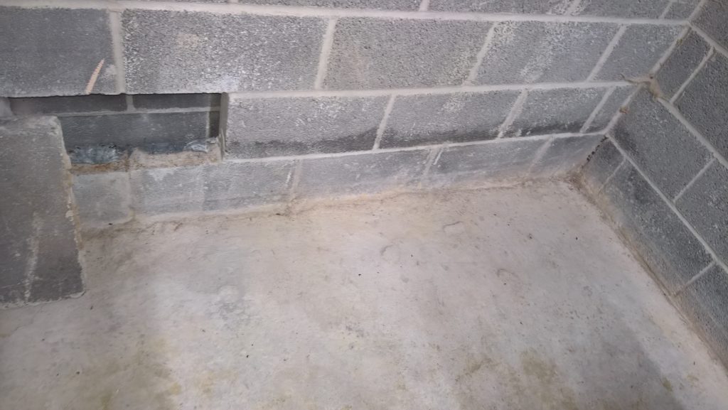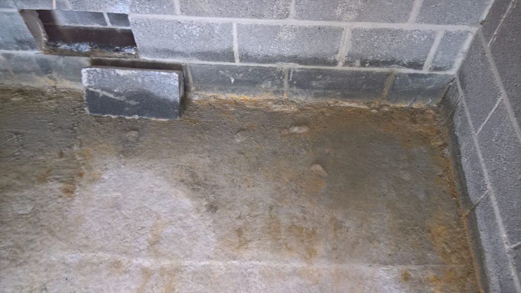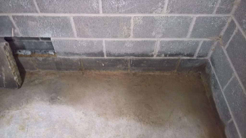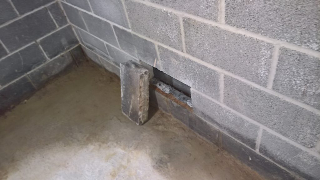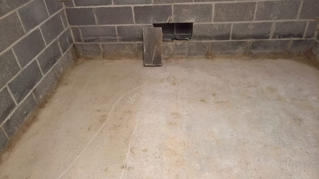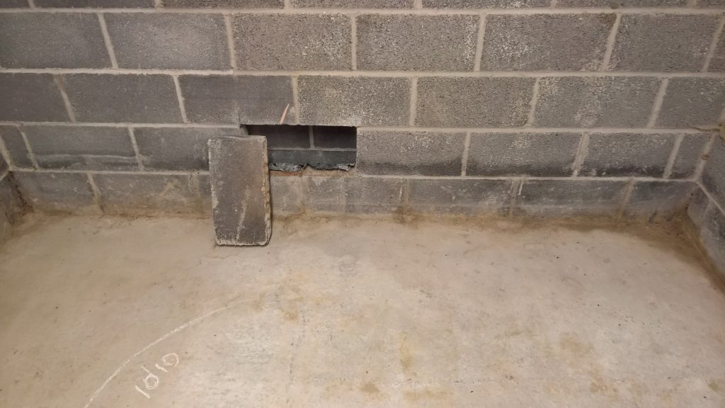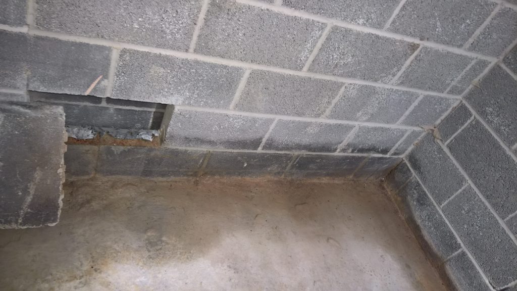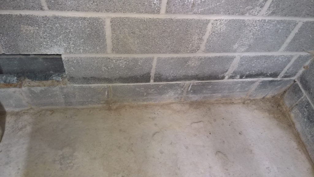 Image above indicating the gap between the concrete raft and the damp proof membrane one block up after the removal of one block from the wall. The ragged profile on the bottom of the hole is the membrane which was damaged during the removal process.