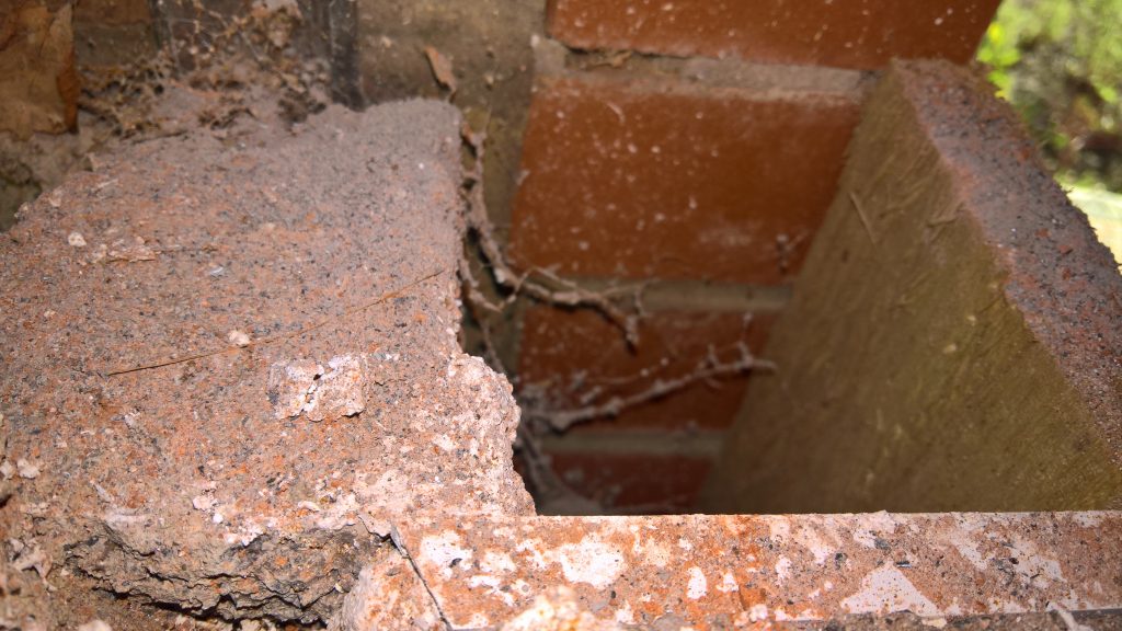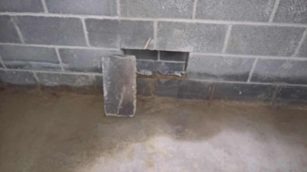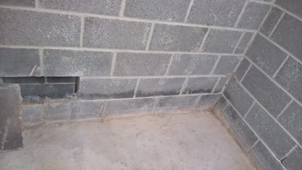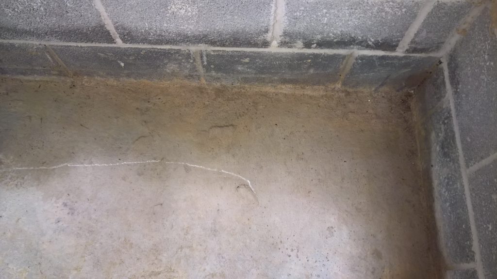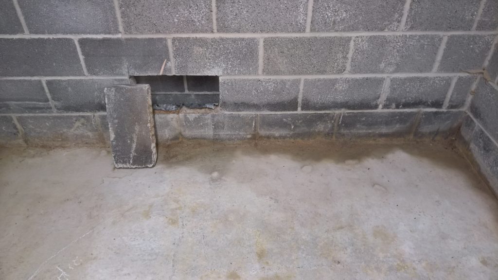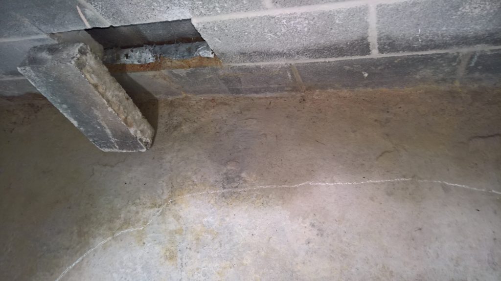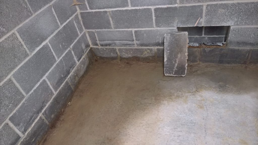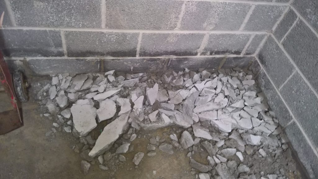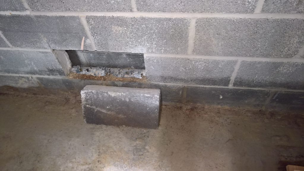Image above indicating the gap between the concrete raft and the damp proof membrane one block up after the removal of one block from the wall. The ragged profile on the bottom of the hole is the membrane which was damaged during the removal process.