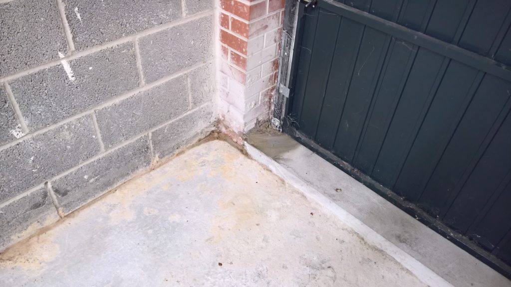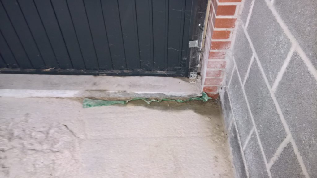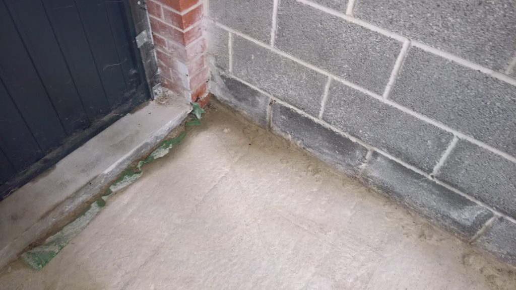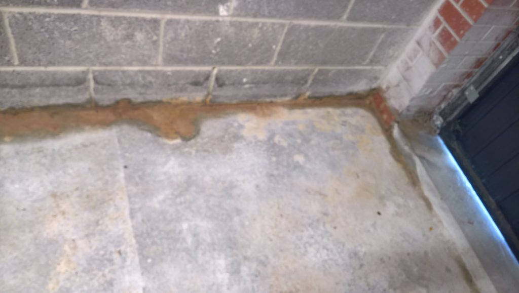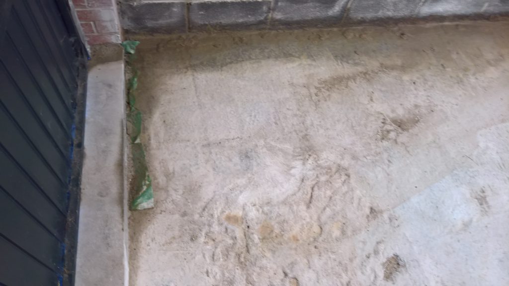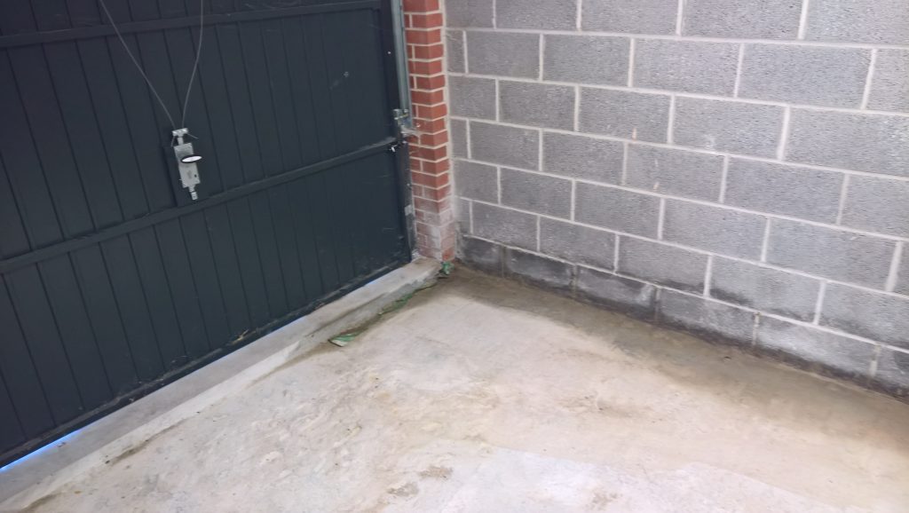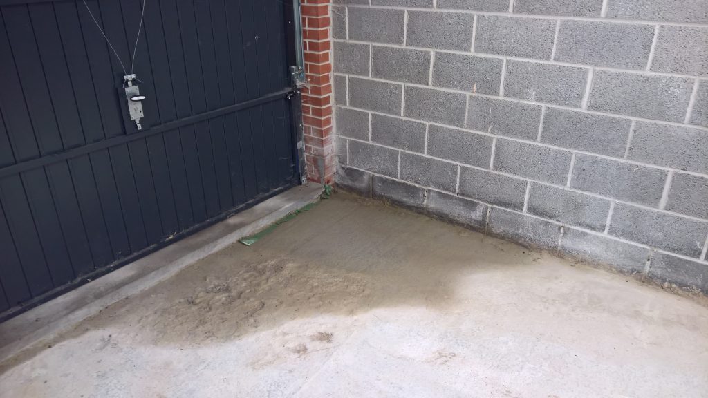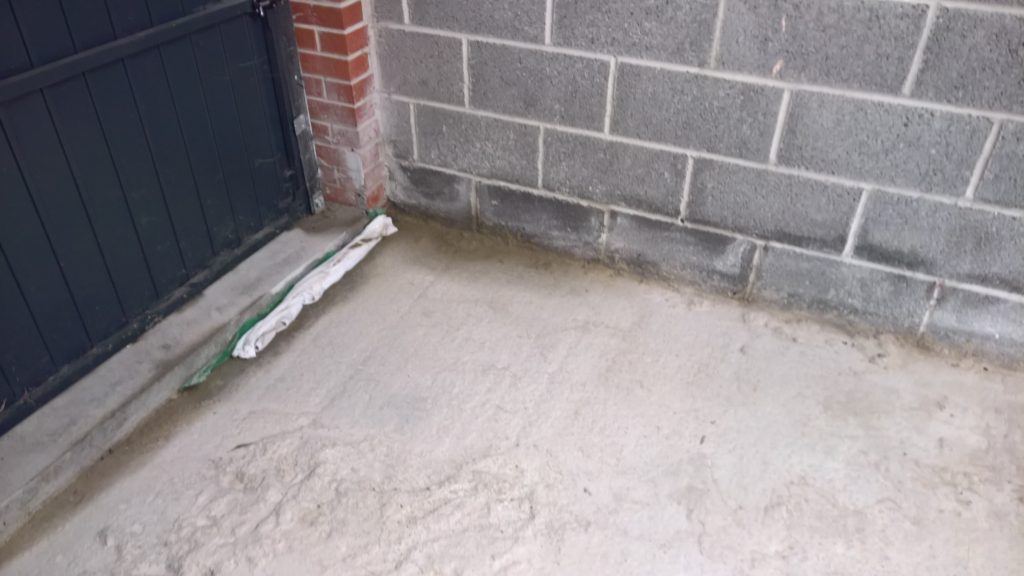 The sliver of screed under the garage door, remains dry and the water is entering under the blocks via this corner of the garage supposedly protected by the green plastic…