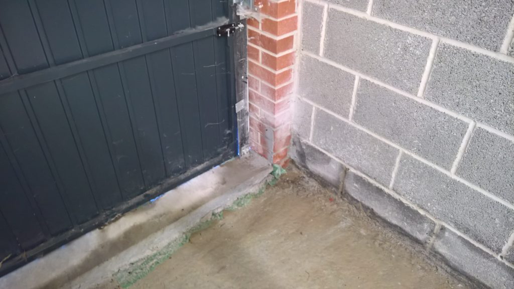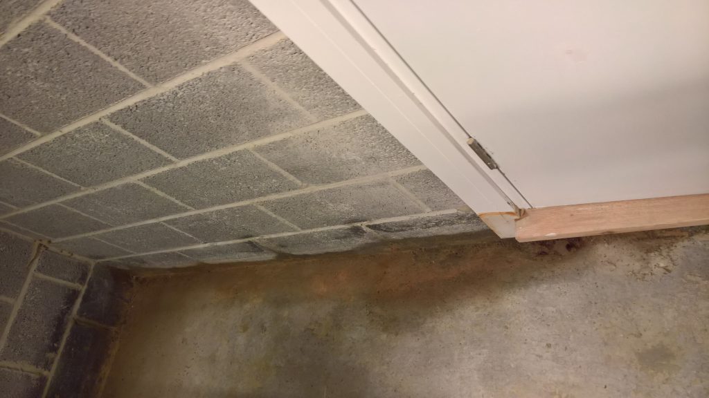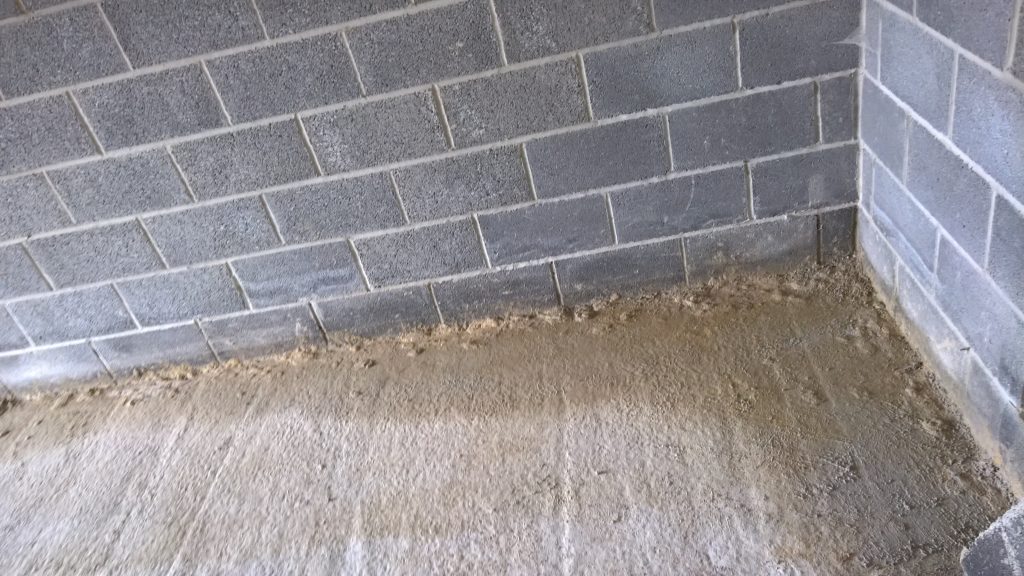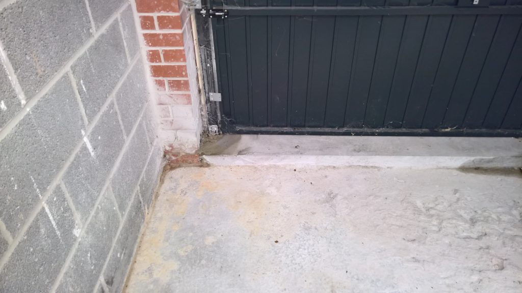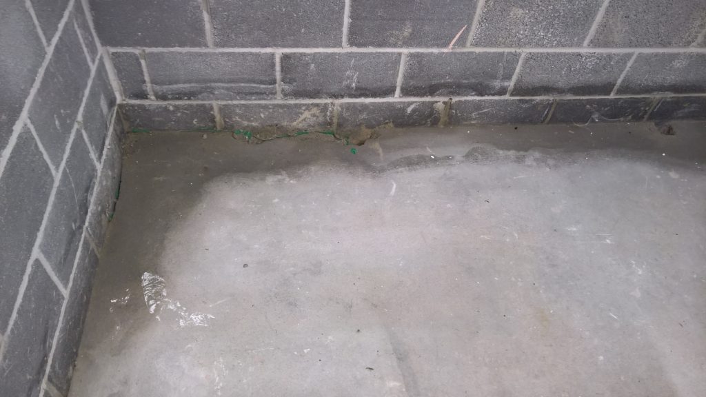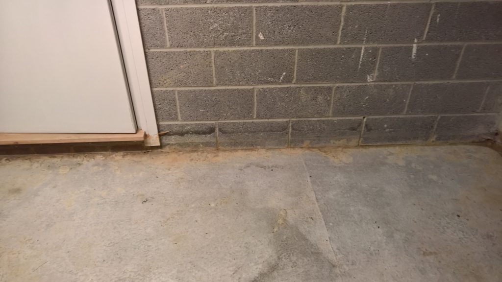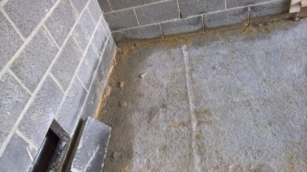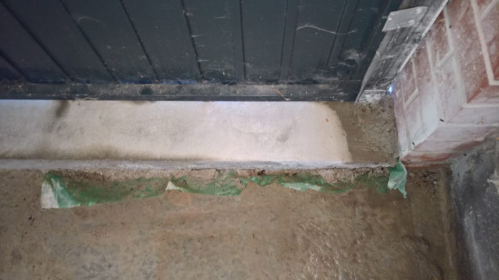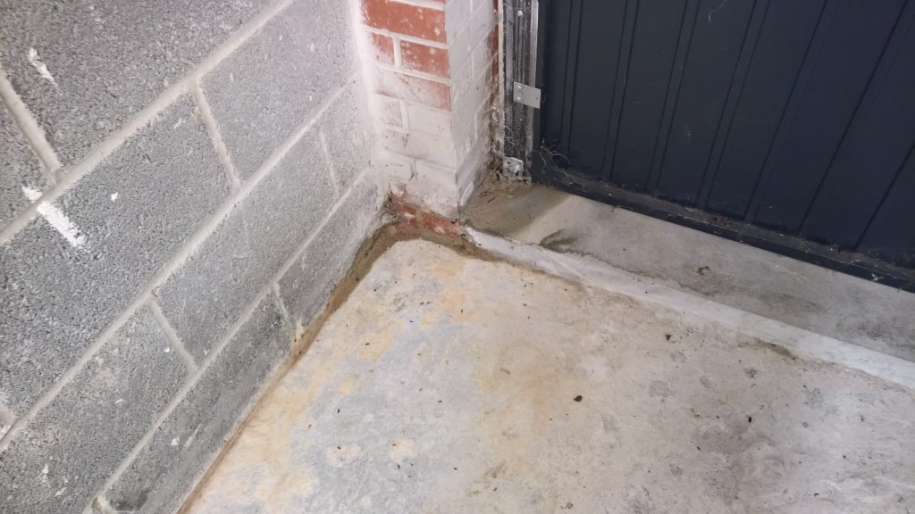 The sliver of screed under the garage door, remains dry and the water is entering under the blocks via this corner of the garage supposedly protected by the green plastic…