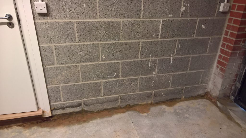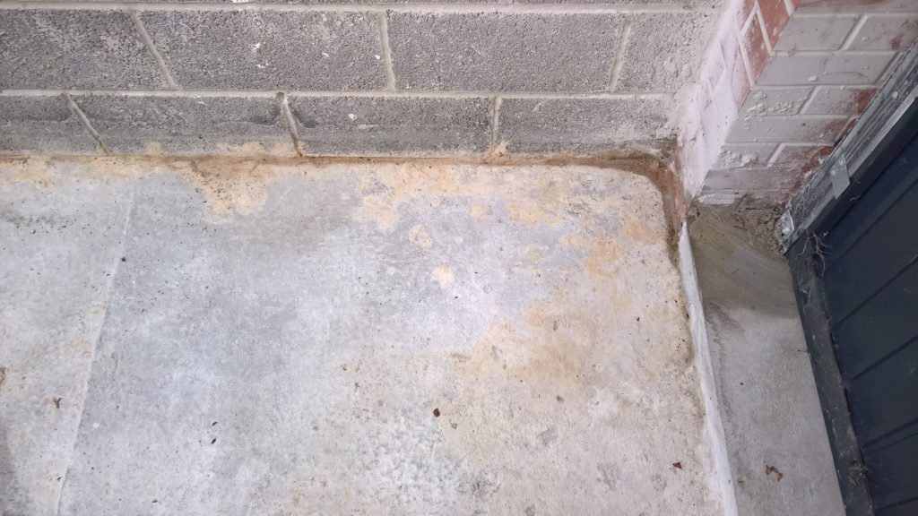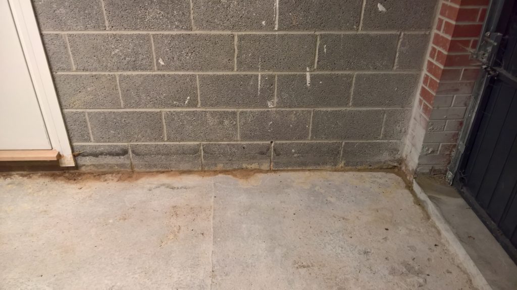 Before the screed was removed this water woud have been sitting sandwiched between the concrete raft and the screed and permeating into the house via the wall adjacent to the gareage which does not have a DPC. The blocks at the side and rear of the house have not been rendered either which further compromises the waterproof envelope.