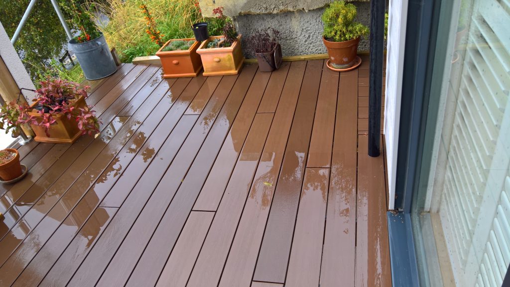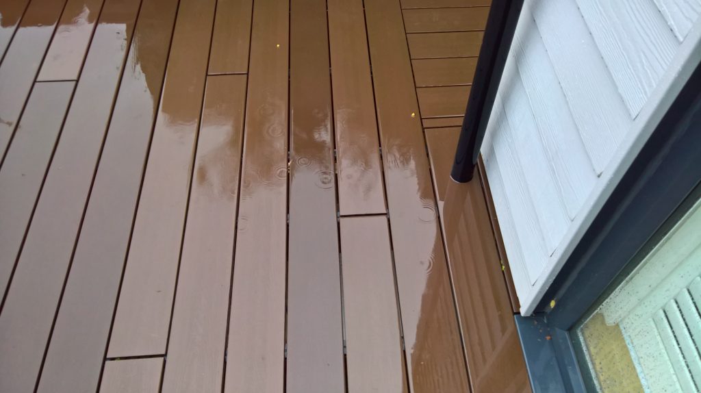 There is no drainage system to deal with the water from the balcony which slopes into the house, so the water pours through the gaps in the boards.