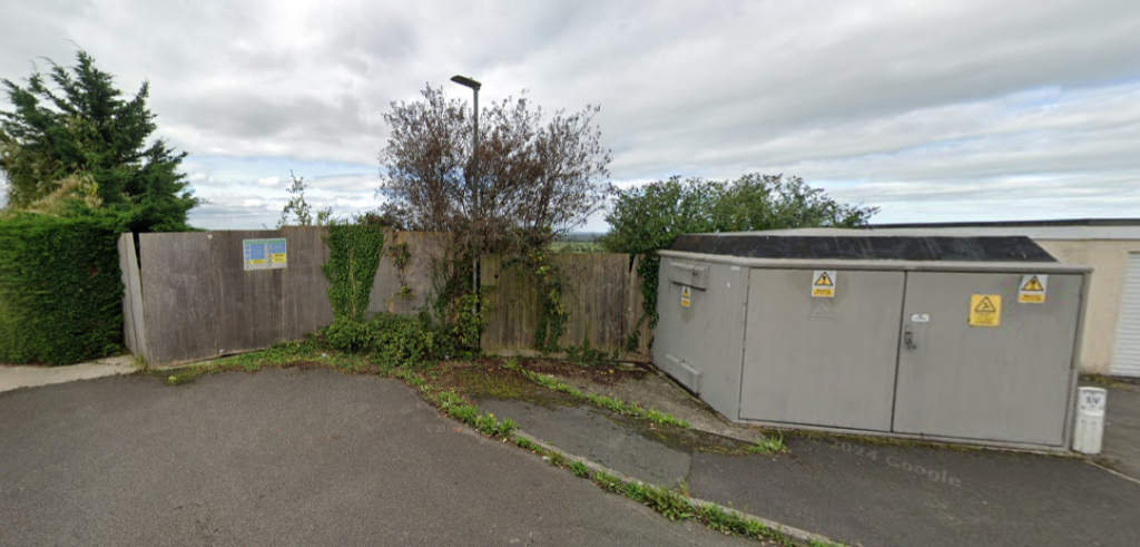 The image below illustrates the entrance to the site and the hill slopes steeply down from here. The box to the right is an electricity generator and as such can not be moved.