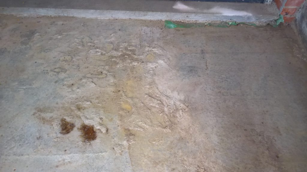 Revealing at least one part of the problem, which is…Water dripping heavily through gaps in the boards of the balcony, then pooling under the balcony in front of garage and then running under the remainder of the screed and green plastic; then finding its way between the plastic, screed and the concrete raft. Water pooling in the indentations left by the concrete mixer, the residue which was beneath the screed.