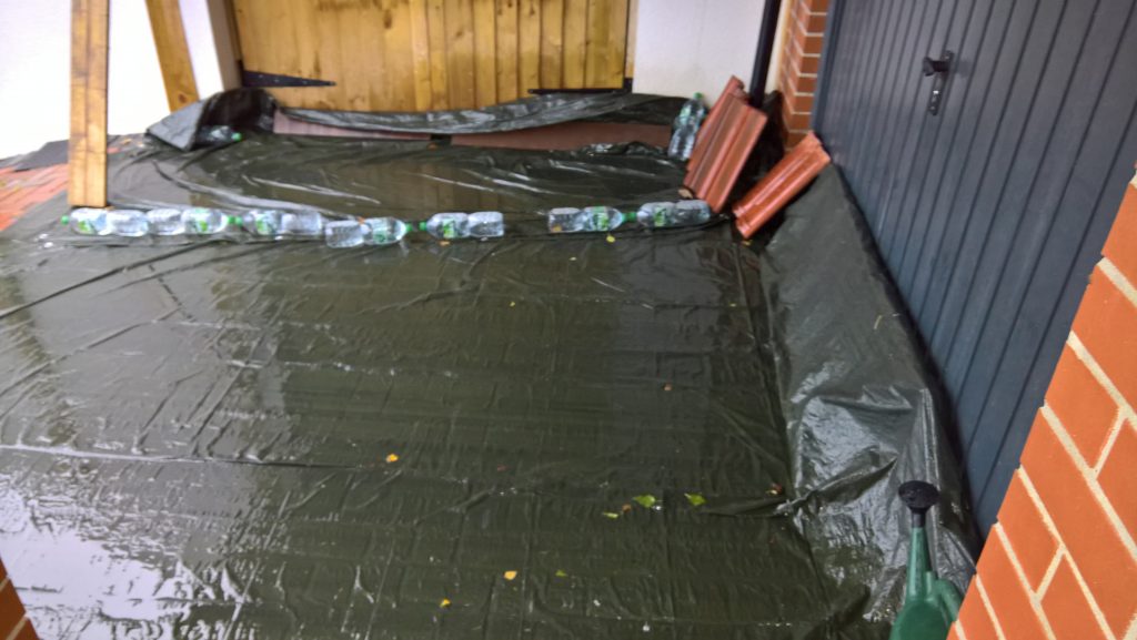 Dry night and dry, sunny day forecast. Tarp in place, garage drying slowly.
