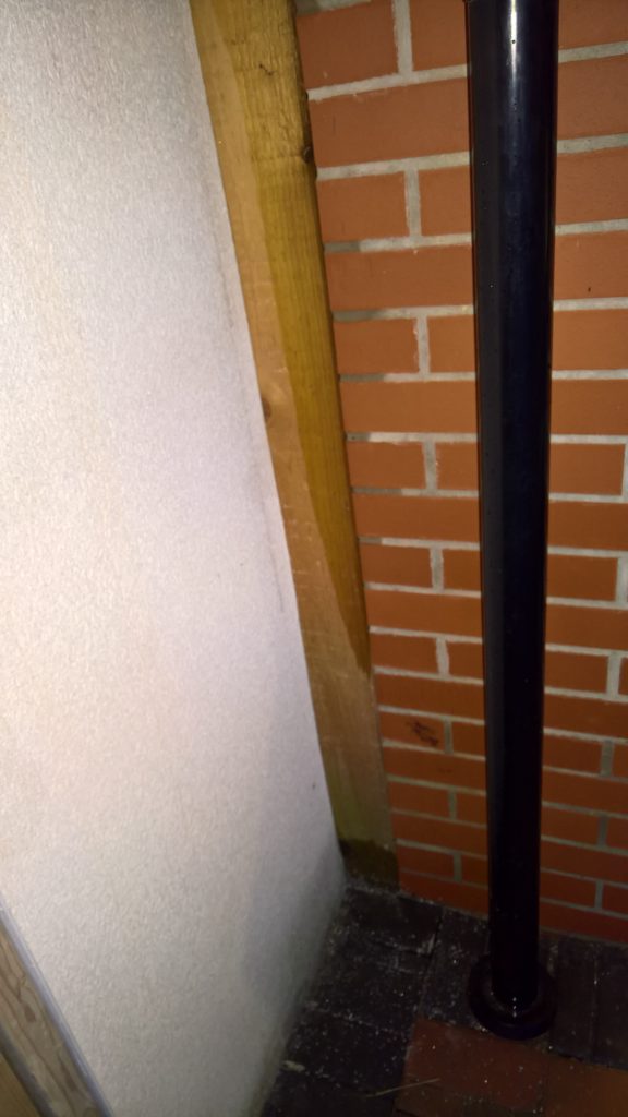 The “hiding board” is stained wet this morning after overnight rain showing evidence that water funnels down here and into the garage. This will be stopped when the corresponding area of the new balcony is established; but not if we leave the old construction in place. This is another vulnerable part of the build; resulting in wet and damp corner in the garage.