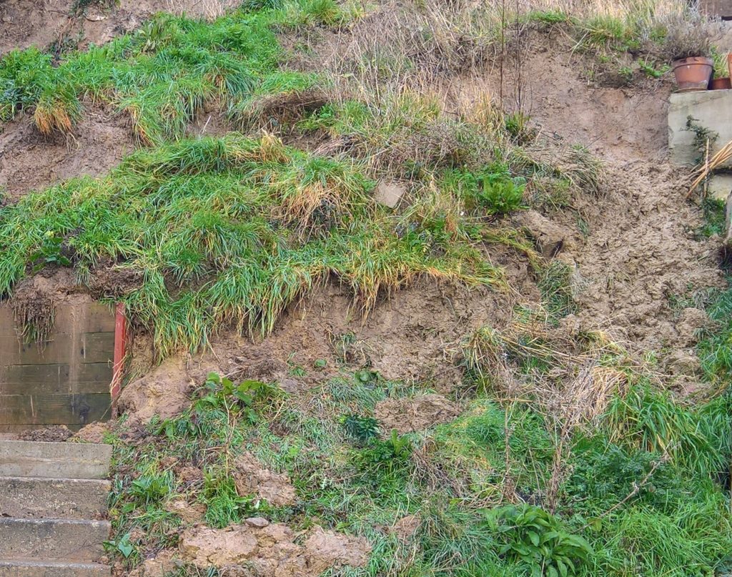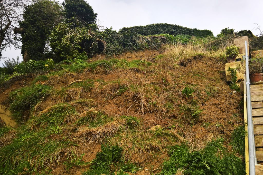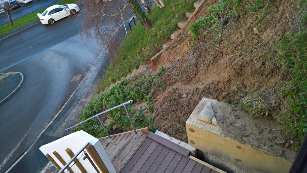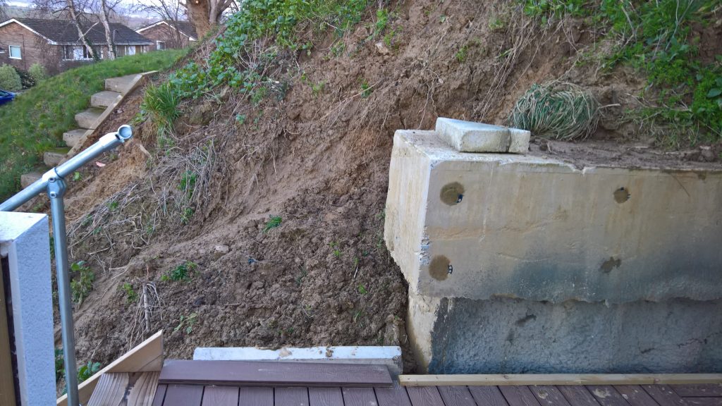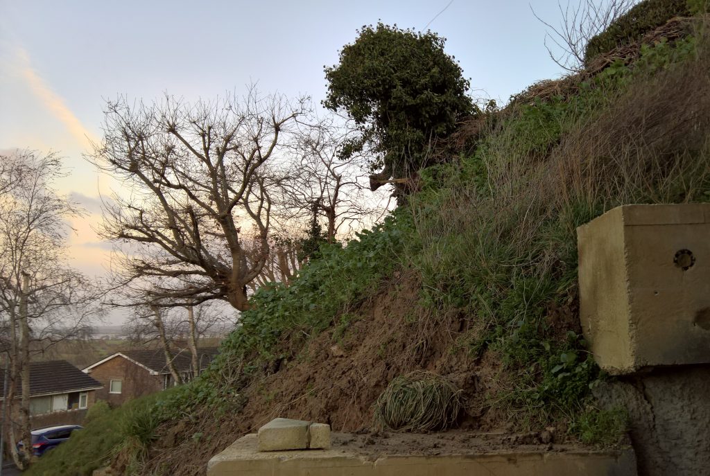 Really, what should have happened at the end of the build was the installation of a series of Gabbion cages to deal with the Lias clay hillside. Taking a huge slice out of a hill with natural springs bubbling throughout, was surely going to be a problem, and so it has proved.