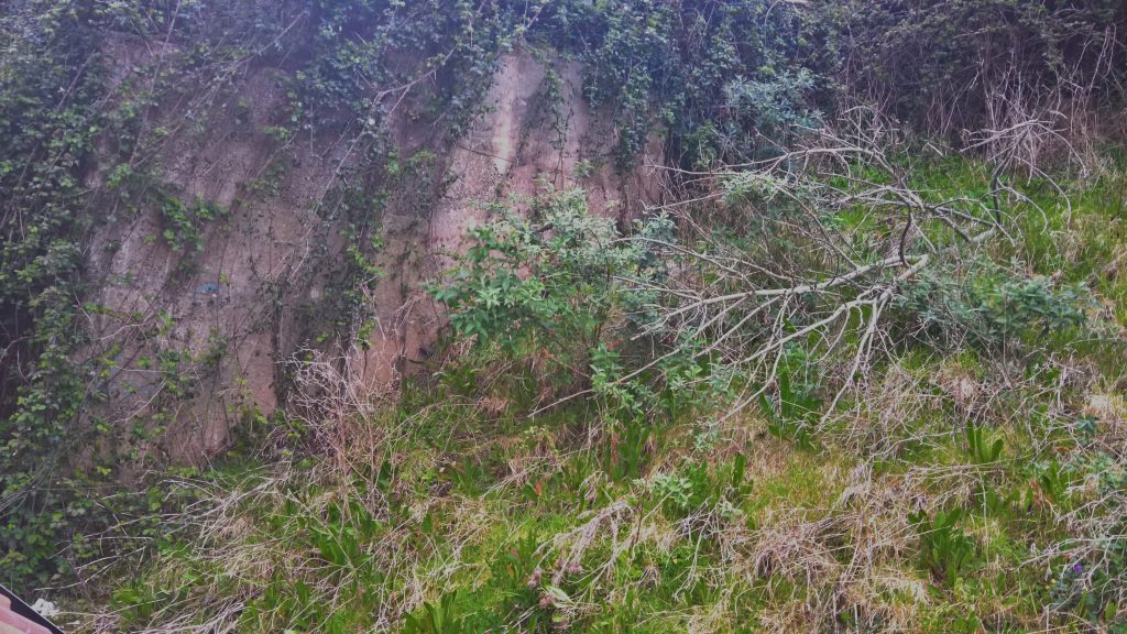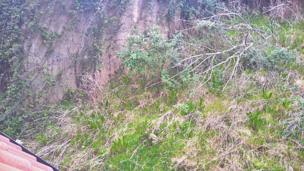 This is part of the hill behind my house and the slope is very steep. The water runoff cascades into the alley behind the house and is torrential during periods of wet weather.